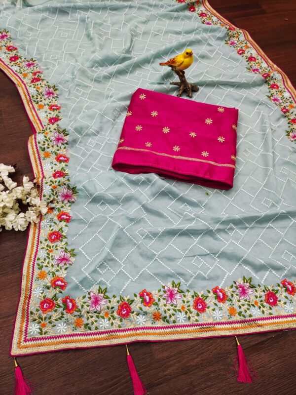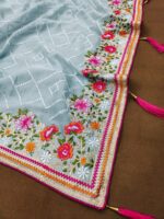 This collection features Thai Organza Silk sarees adorned with beautiful designer multicolour thread and zari dori embroidery work on both the body and border, showcasing intricate craftsmanship. The sarees are pure and elegant. The accompanying blouse, made of Mono Diamond Silk, features beautiful designer zari thread embroidery work and is unstitched with a pattern of 0.80. It sounds like a stunning and sophisticated ensemble.