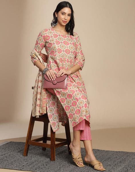 Beige Cotton Printed A-Line Kurta Set