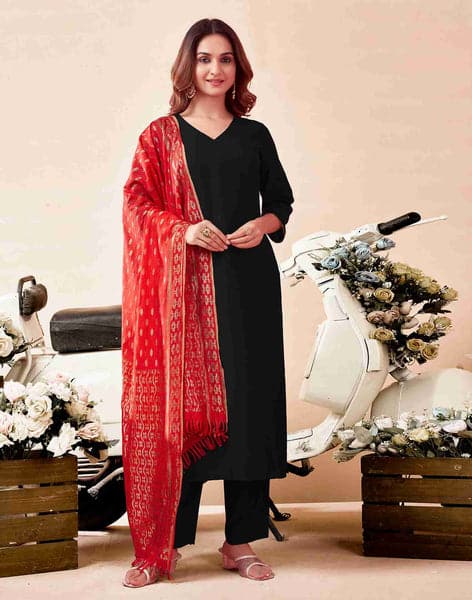 Black Printed Rayon Straight Kurta With Pant And Dupatta