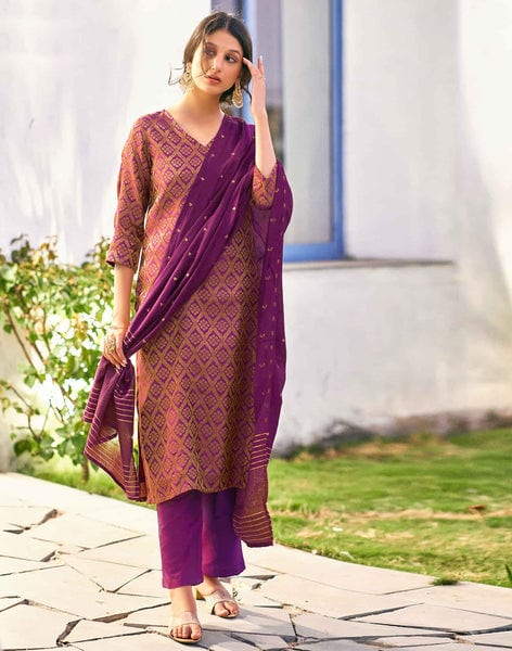 Dark Magenta Woven Brocade Straight Kurta With Pant And Dupatta
