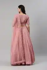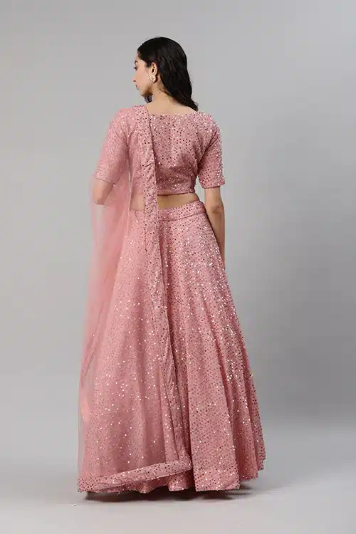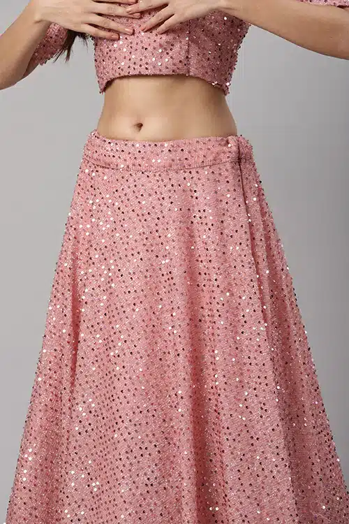 Indulge in the opulence of Dusty Peach Velvet with sequins embroidered throughout the lehenga and choli. The intricate detailing adds a touch of glamour, making you stand out at every celebration. The semi-stitched lehenga choli set ensures a customized fit, though please note it will not come with drawstring and latkan. The can-can attached inside the lehenga adds a graceful flare to your movements.