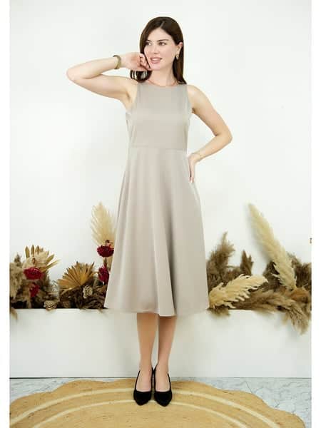 Exude Golden Glow Satin Dress with Pockets (Beige)