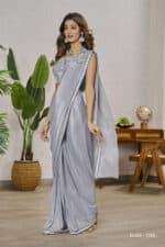This Ready To Wear Saree and Stitched Poncho Style Blouse is the perfect combination of elegance and sophistication. Featuring a beautiful grey shimmer georgettes material with exquisite embroidery and sequins work, along with an elegant broach on the pallu and waist belt, this striking ensemble will make any special occasion unforgettable.