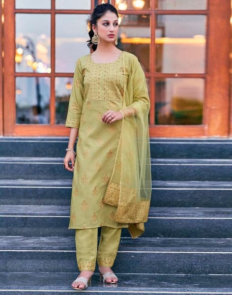 Khaki Printed Cotton Straight Kurta Set with Dupatta