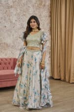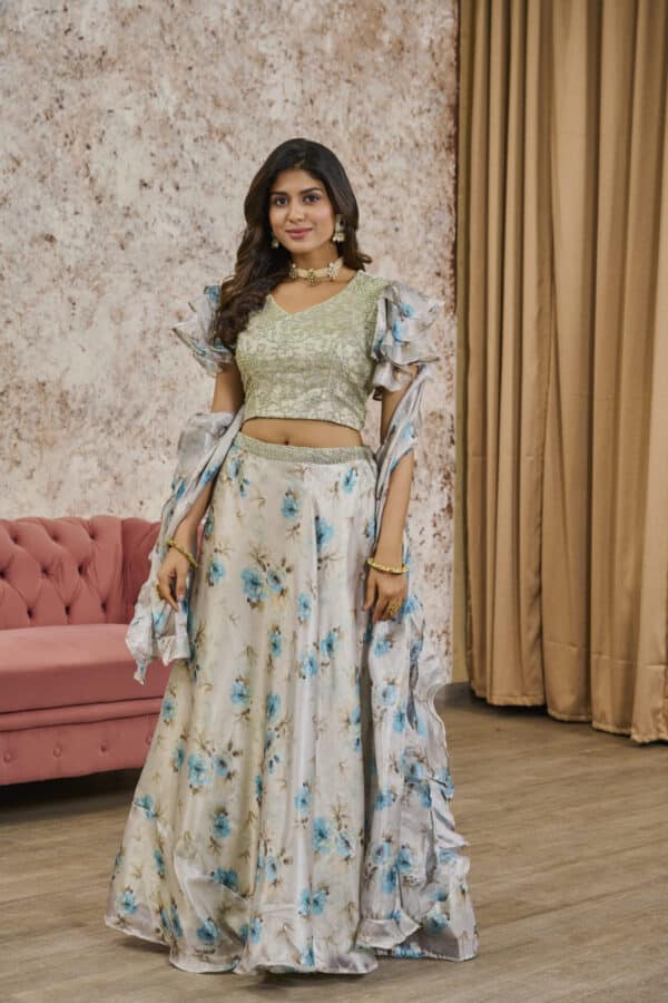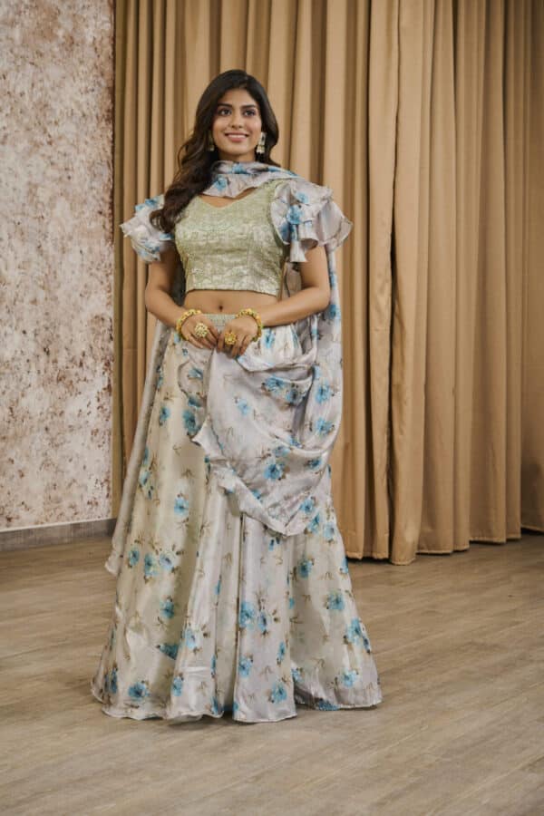 This Light Green Tissue Heavy Embroidery Lehenga is perfect for special occasions. The artfully designed tissue fabric is light and airy, embellished with intricate heavy embroidery for a truly luxurious effect. This stunning piece is sure to turn heads.