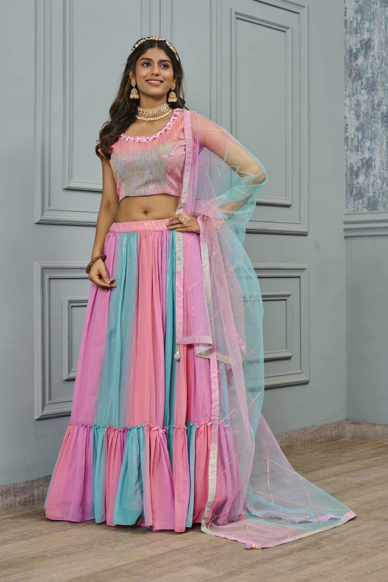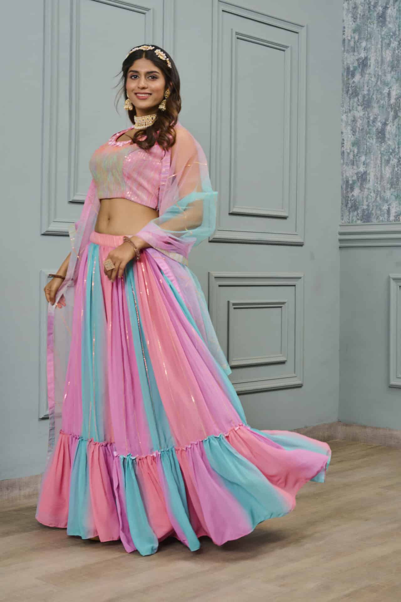 Multicolor Shimmer Georgettes Heavy Embroidery Lehenga