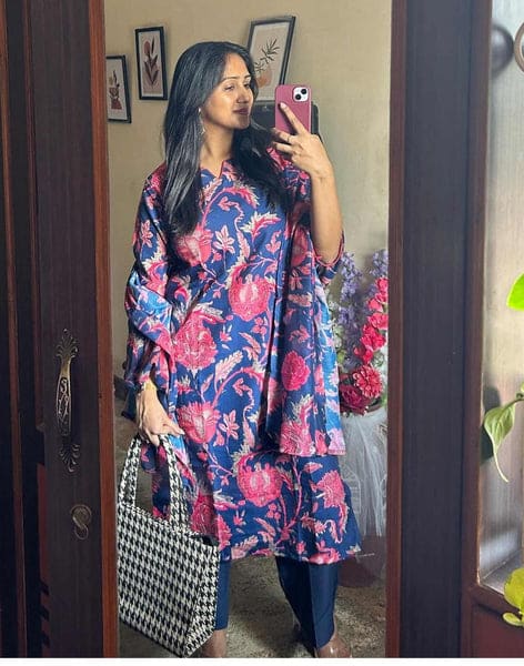 Navy Blue Printed Rayon Straight Kurta With Pant And Dupatta