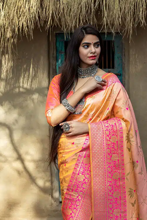 Perfect for Special Occasions: This Light Orange Banarasi Weaving Silk Exclusive Saree is designed to make a statement at special occasions. The combination of the unique design and high-quality silk fabric ensures that you’ll stand out with elegance and style.