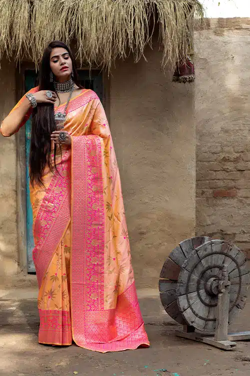 • Unique Banarasi Design: The light orange Banarasi Weaving Silk Saree features a distinctive design, showcasing the intricate Banarasi weaving work that sets it apart, making it perfect for special occasions.