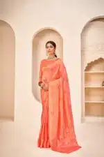 - Beautiful Peach Hue: The saree features a beautiful peach hue, adding a touch of softness and elegance to your overall look.