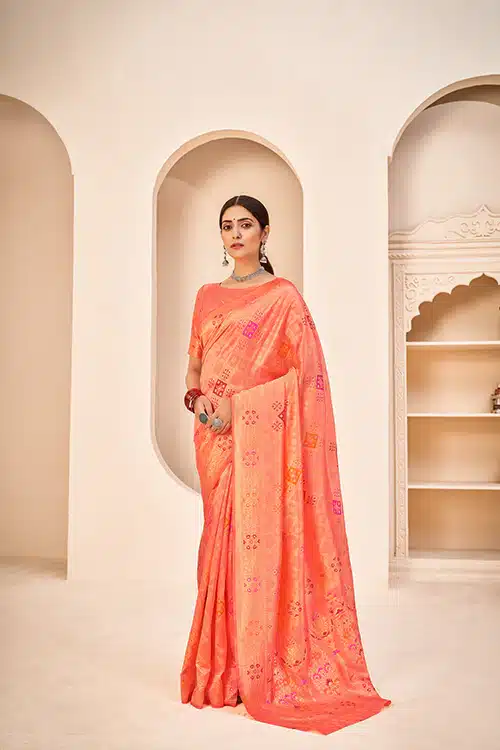 Perfect for Traditional Occasions: This Peach Banarasi Silk Saree with Patola Weaving Silk is perfect for traditional occasions where you want to showcase your appreciation for craftsmanship and style. Whether it’s a wedding, festive celebration, or cultural event, this saree is sure to leave a lasting impression.