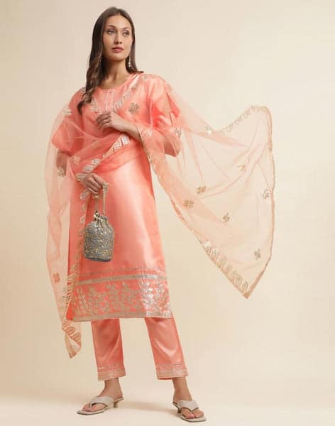 Peach Embroidery Silk Straight Kurta With Pant And Dupatta