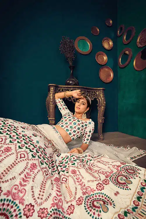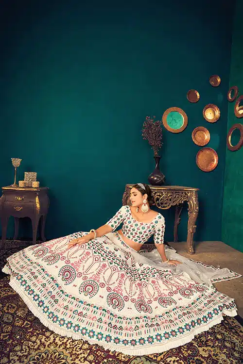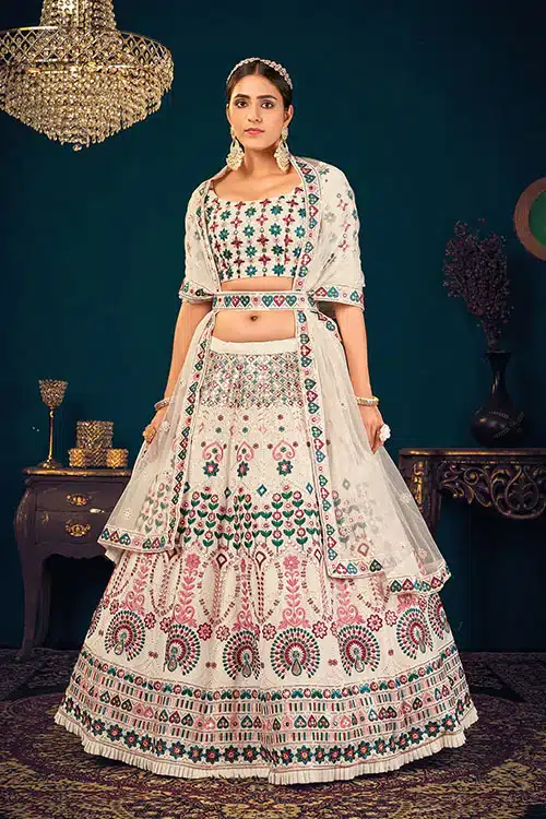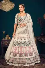 Immerse yourself in the enchanting allure of pearl white, beautifully complemented by the intricate detailing of multi-thread sequins and Gota Patti embroidery. Step into a world where tradition meets contemporary sophistication, and let your bridal journey begin with this Pearl White Georgette Wedding Wear Bridal Lehenga Choli Set. It’s not just an outfit; it’s a reflection of your unique style and the start of a beautiful chapter.