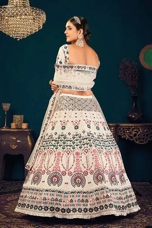 Elevate your bridal look with our Pearl White Georgette Wedding Wear Bridal Lehenga Choli Set. This stunning ensemble is a testament to timeless elegance, blending traditional craftsmanship with modern aesthetics.