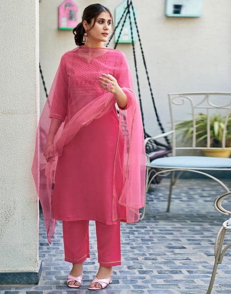 Pink Cotton Embroidery Straight Kurta Set