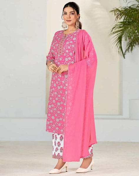 Pink Printed Rayon Straight Kurta With Pant And Dupatta