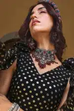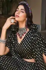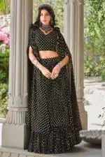 The lehenga is thoughtfully designed to cater to different sizes, providing a comfortable and flattering fit. The metallic foil work continues on the georgette choli, enhancing the overall elegance of the ensemble. The fancy dupatta, attached with the choli, adds the perfect finishing touch to this glamorous look.