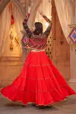 This designer chaniya choli is perfect for Navratri. Featuring a stunning red contrast with a black koti-style design, this outfit is sure to make a bold statement. Crafted with attention to detail, this stylish and comfortable garment is made from the finest quality materials. Make an unforgettable entrance in this beautiful designer garment.