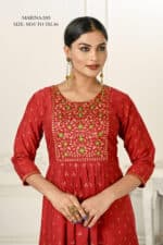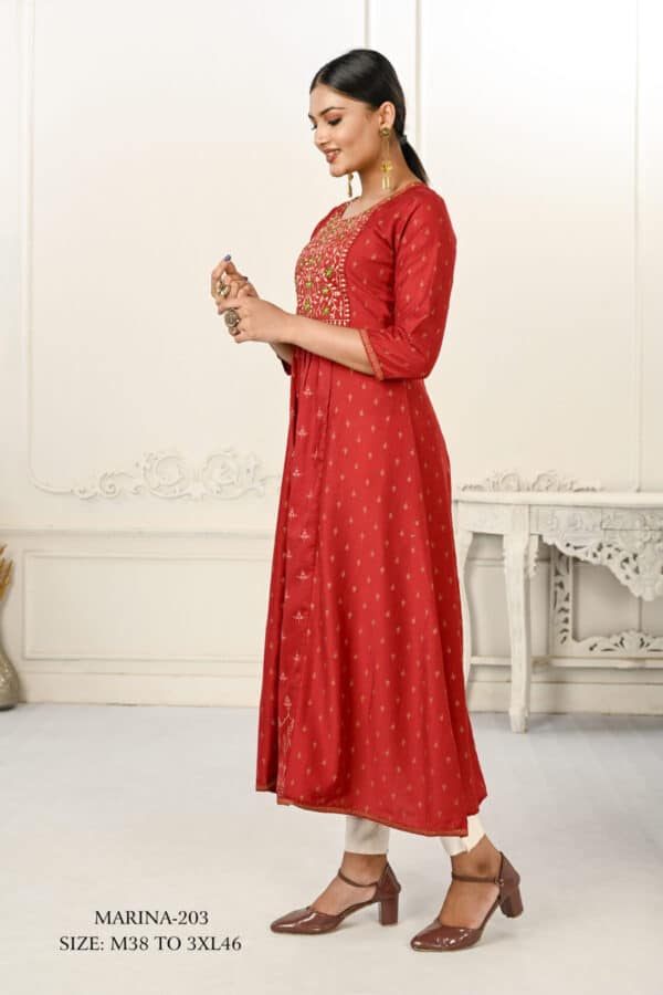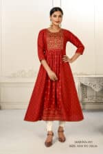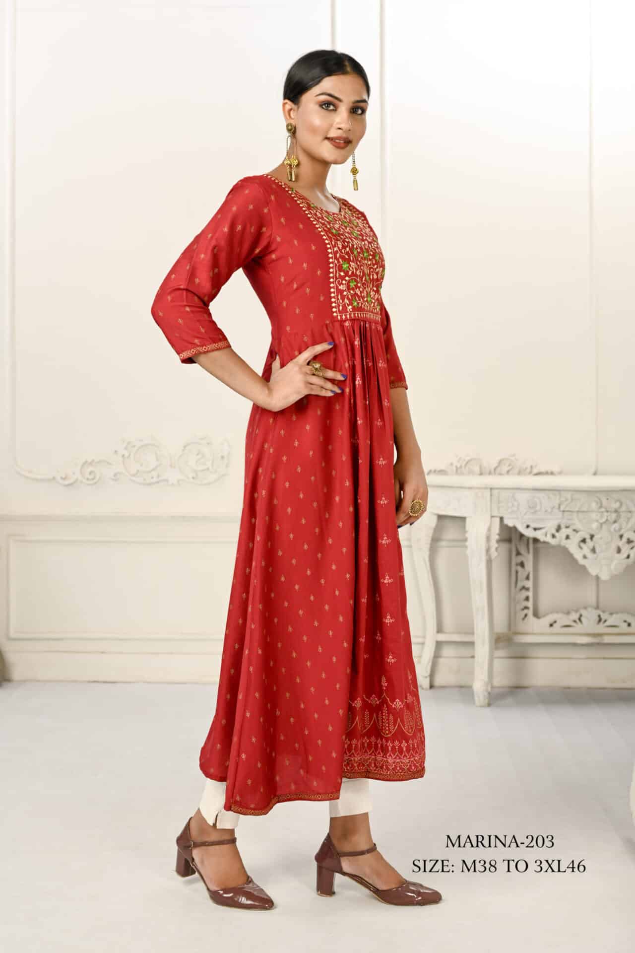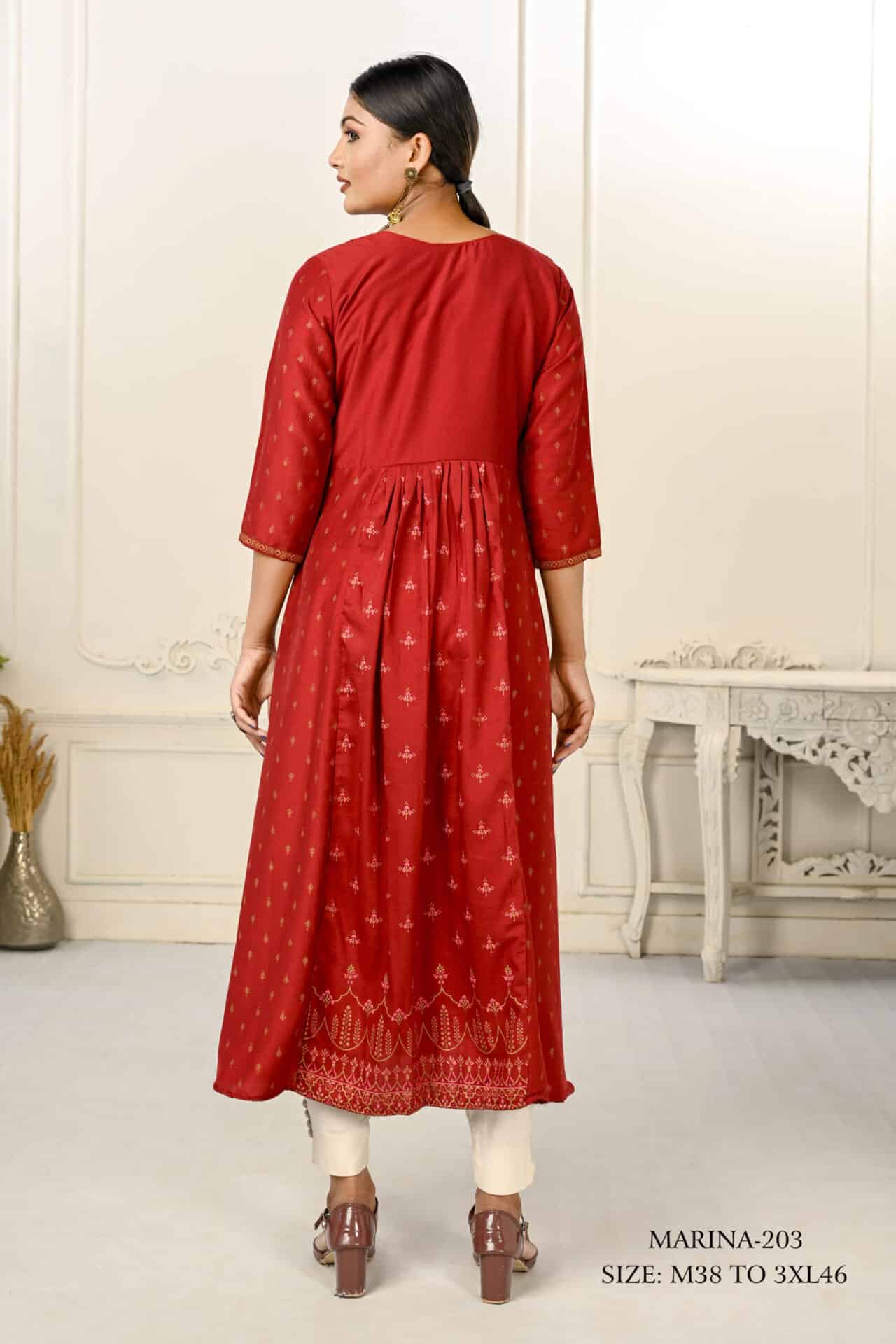 This stylish Red Cotton Kurti provides a unique look, thanks to the handprint embroidered design. Made from 100% cotton, this kurti is lightweight and comfortable, perfect for warmer weather. The timeless design ensures it will always be in style.