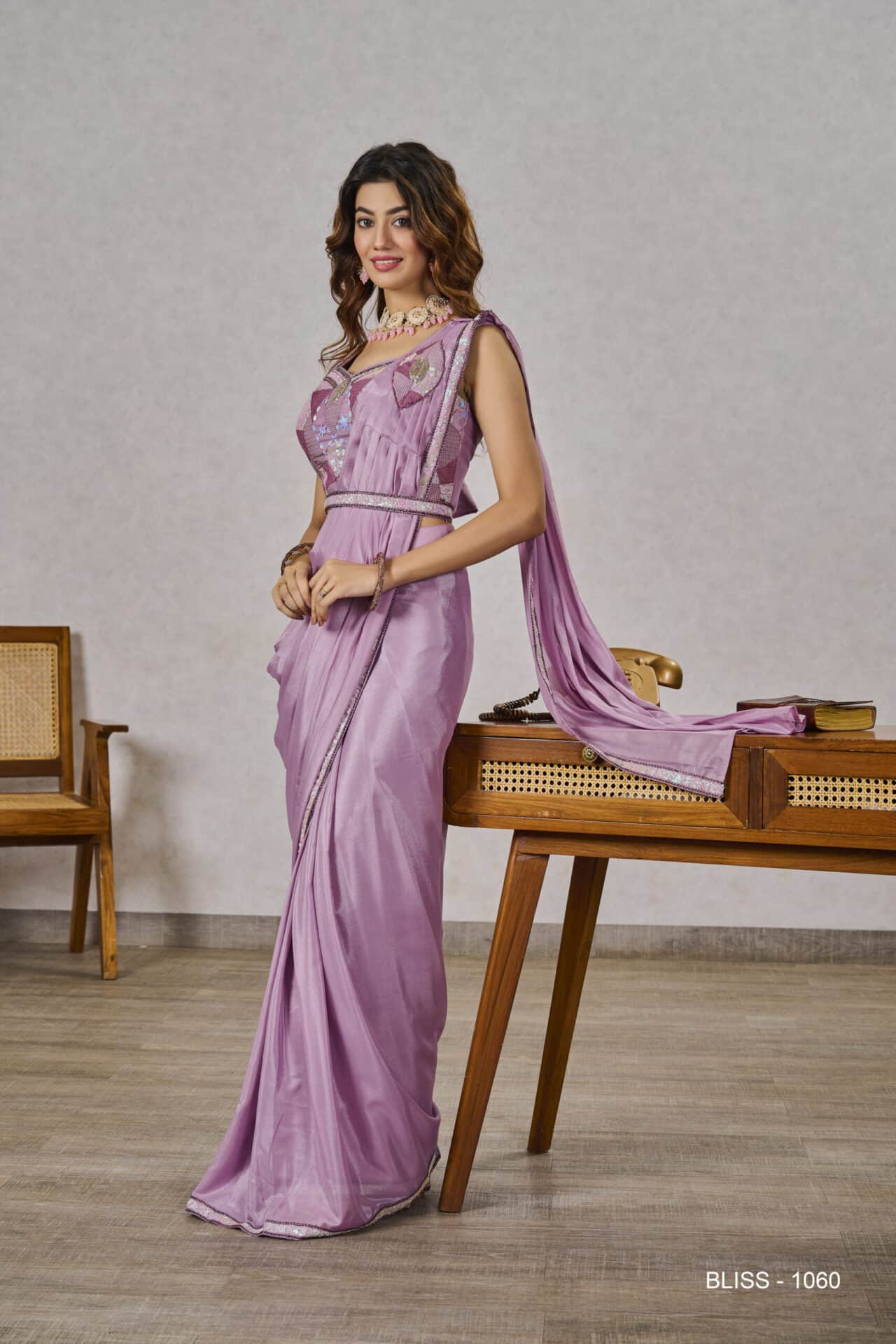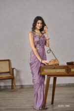 This Ready To Wear Saree & Stitched Blouse with Embroidery and Sequins Work is a stylish and timeless addition to a woman’s wardrobe. Crafted from mauve shimmer georgettes, this look features stunning embroidery and sequins work, with a fixed broach on the pallu and a waist belt to complete the look.