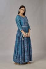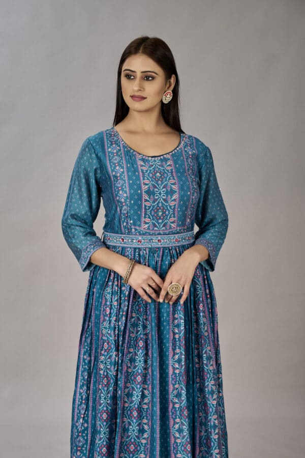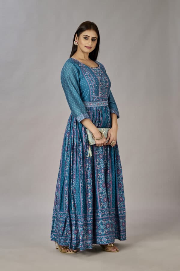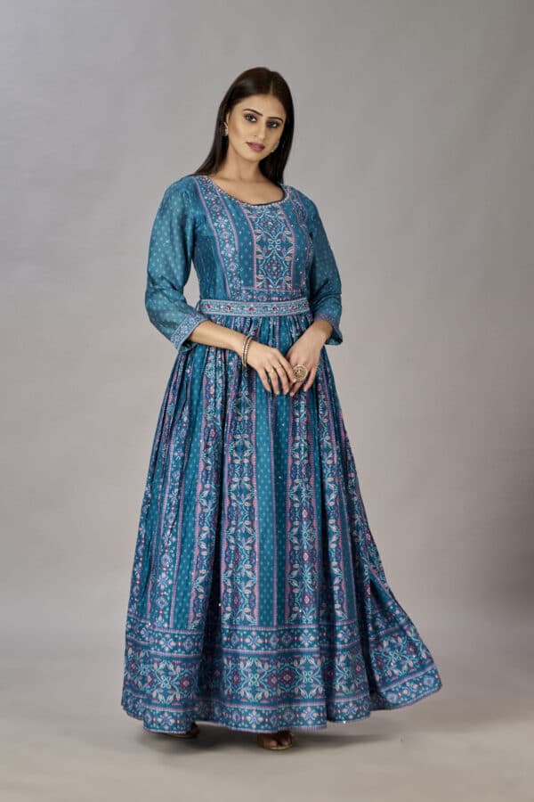 This Teal Blue Muslin Silk Gown is perfect for a special occasion. Crafted from 100% muslin silk and embroidered with delicate sequins, it will make you the star of the night. Featuring a unique digital print and heavy design, this beautiful gown will make an unforgettable impression.