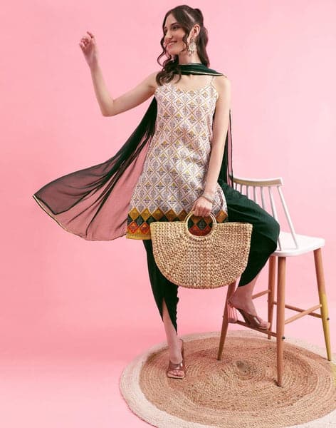 White Cotton Printed A-Line Kurta With Pant And Dupatta