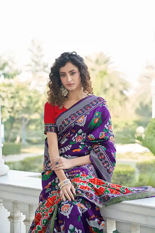 Style Tip: Pair these sarees with traditional jewelry, such as statement earrings and bangles. Opt for a classic hairstyle and choose accessories that complement the Patola Weaving Silk for a cohesive and elegant look.