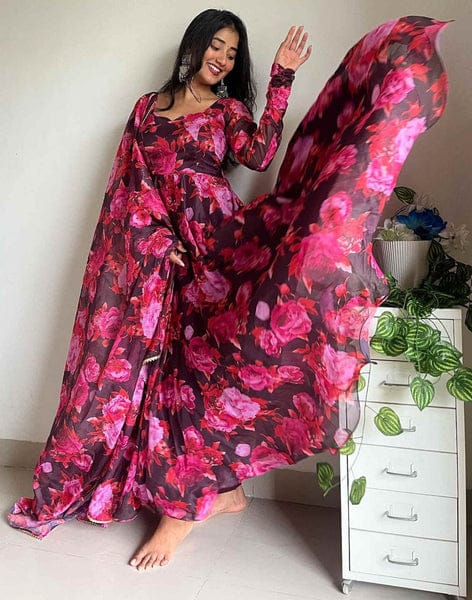Wineย Printed Georgette Flared Kurta With Dupatta