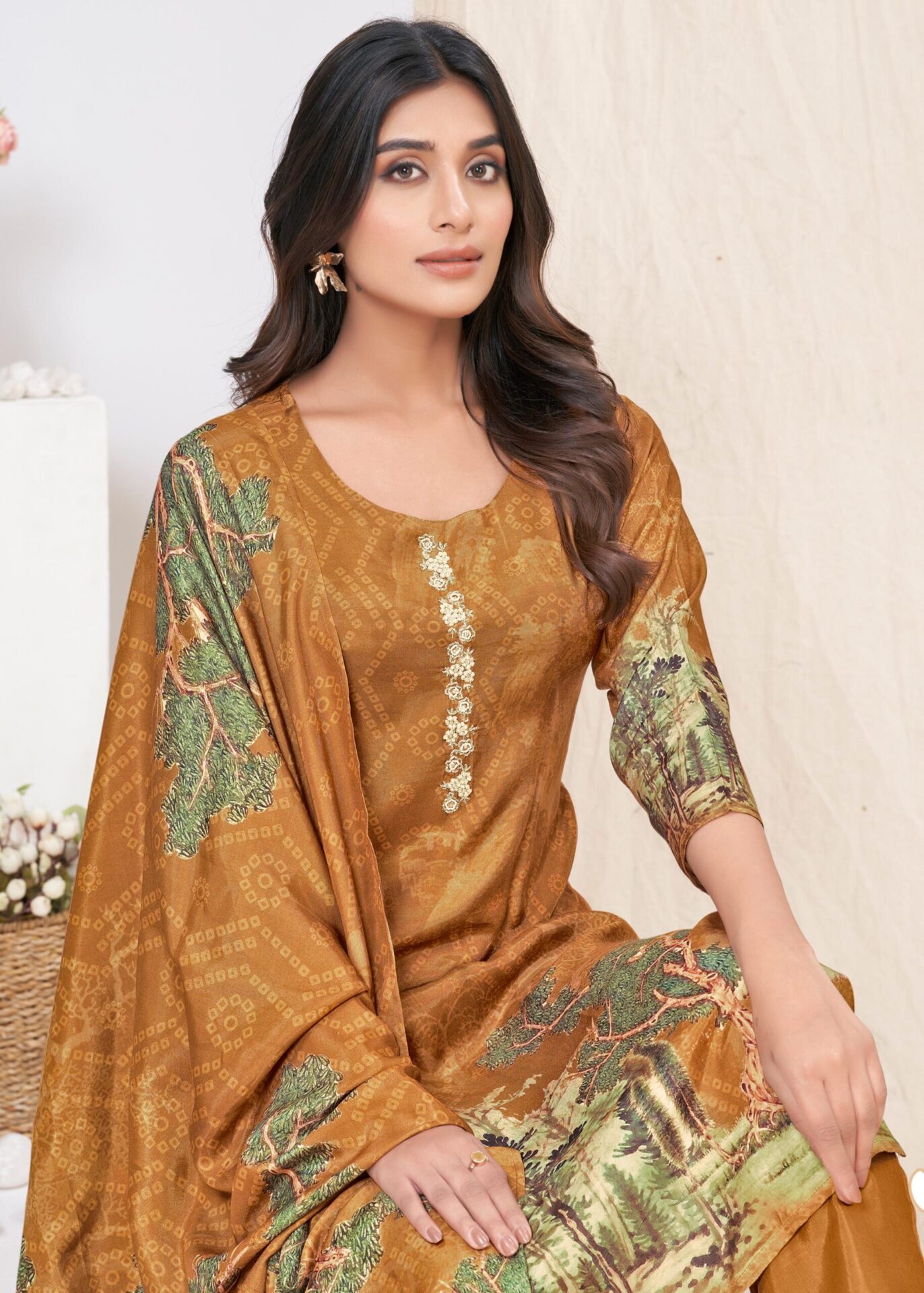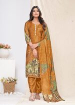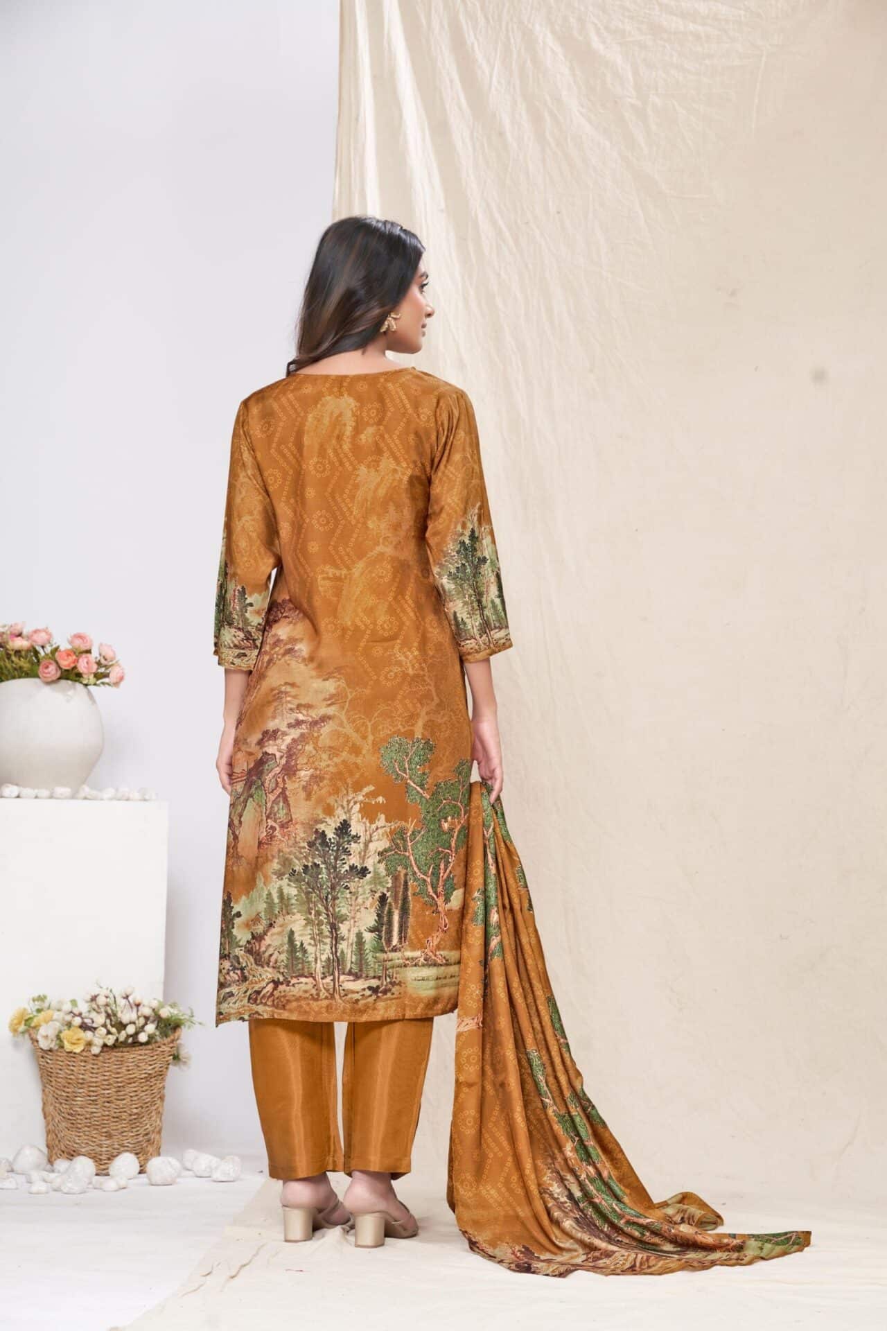 Women Muslin Digital Print Handwork Embroidery Sequence Work Salwar Kameez – Brown