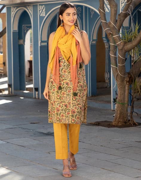 Yellow Printed Rayon Straight Kurta With Pant And Dupatta